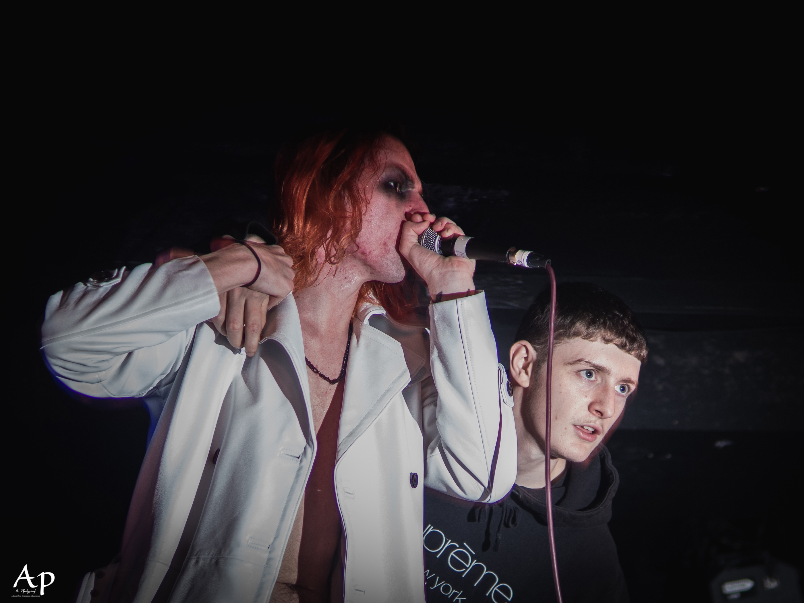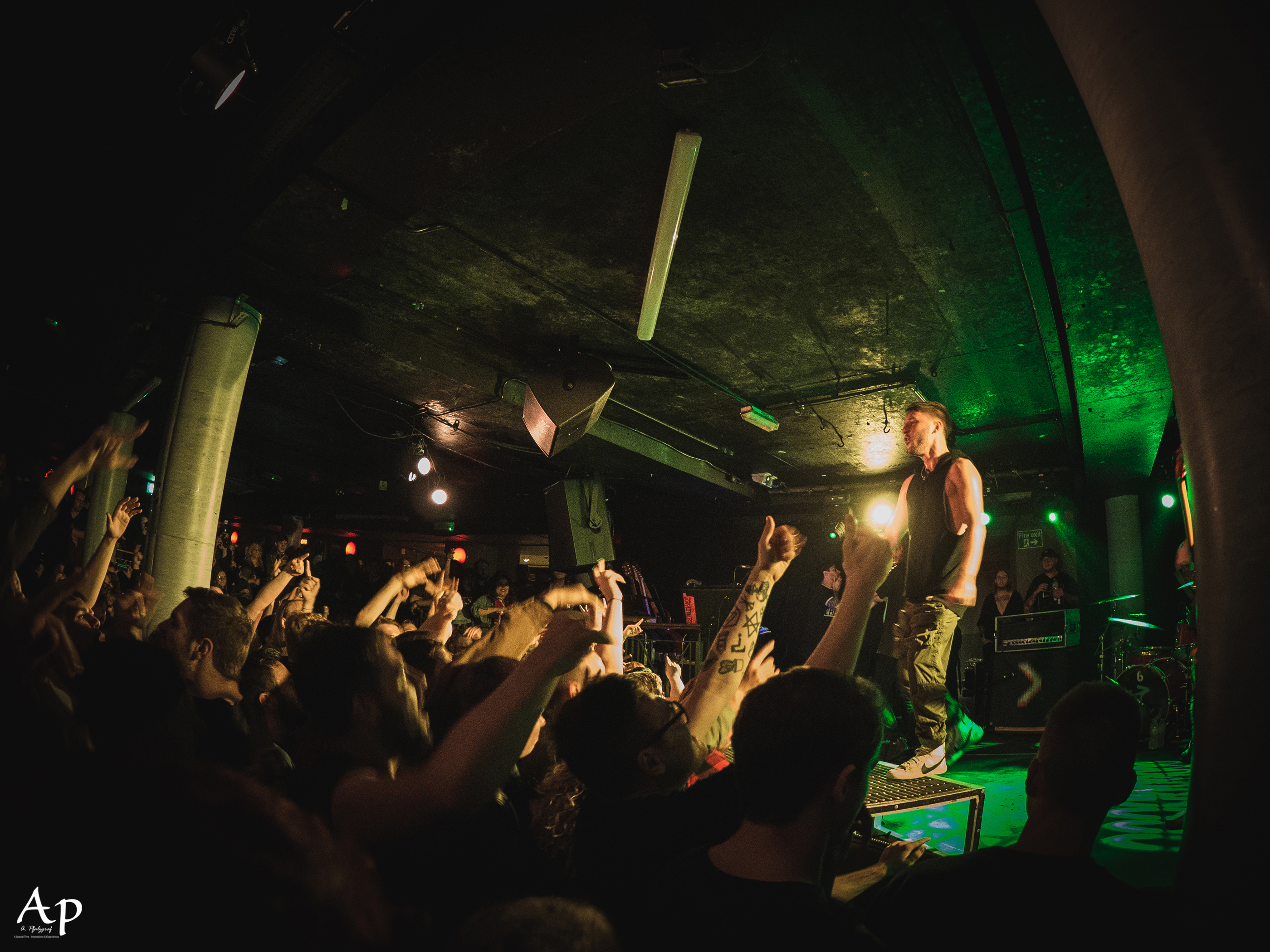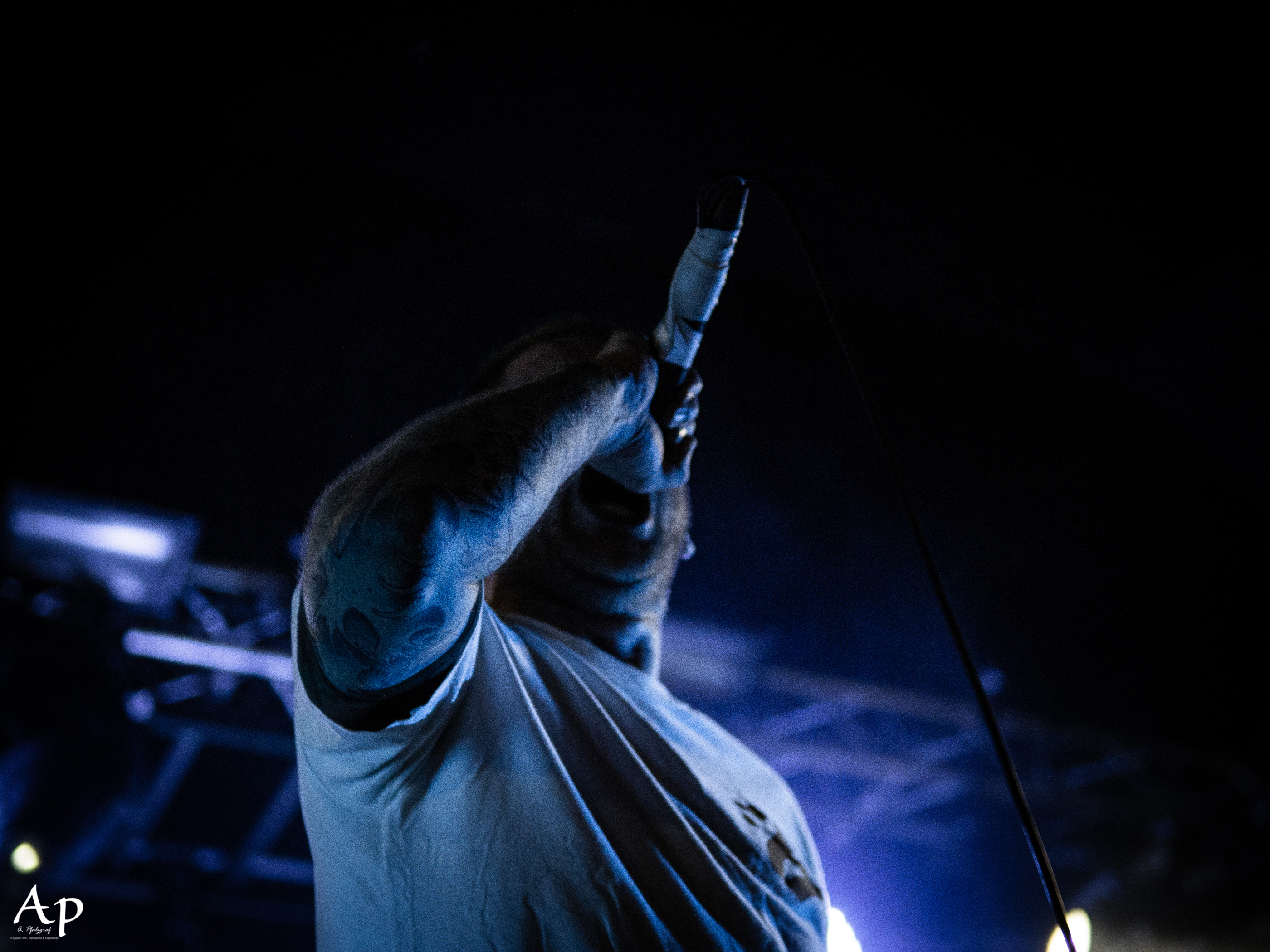 The venue opened its doors around 6.30pm and filled up steadily with a quite mixed but rather younger crowd. First act on the stage was the mysterious Bristol based trap-metal artist The Well Runs Red with a mix of hardcore, rap, trap, metal, horrorcore and industrial, to get the crowd moving.