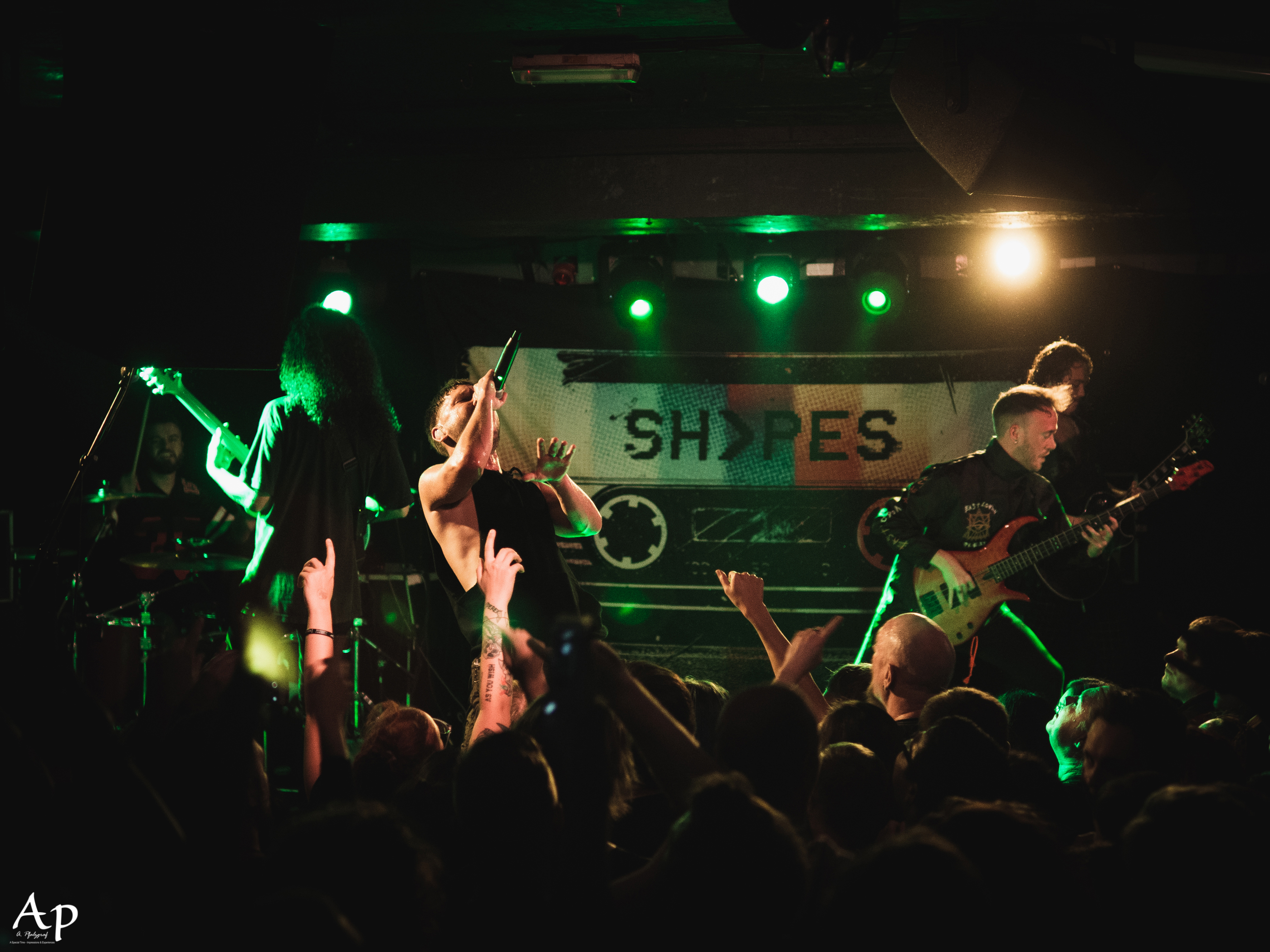 The British rock band SHVPES just released a new single ‘One Man Army’ (2019, Spinefarm Records) and hit the road for two headlining shows in the UK one of which was in London at the Underworld. Formed in 2009, the Birmingham based quintet comprise vocalist Griffin Dickinson, both guitarists Ryan Hamilton and Youssef Ashraf, bassist Grant Leo Knight and drummer Harry Jennings, mixing elements of metalcore and nu metal with heavy hip hop and rap. The heavy guitar sound supports Griffins alternation between soaring screams and rapping. So far the outlet released two full-lenth albums being their debut ‘Pain. Joy. Ecstasy. Despair’ (2016, Spine Farm Records) and ‘Greater Than’ (2018, Spine Farm Records).